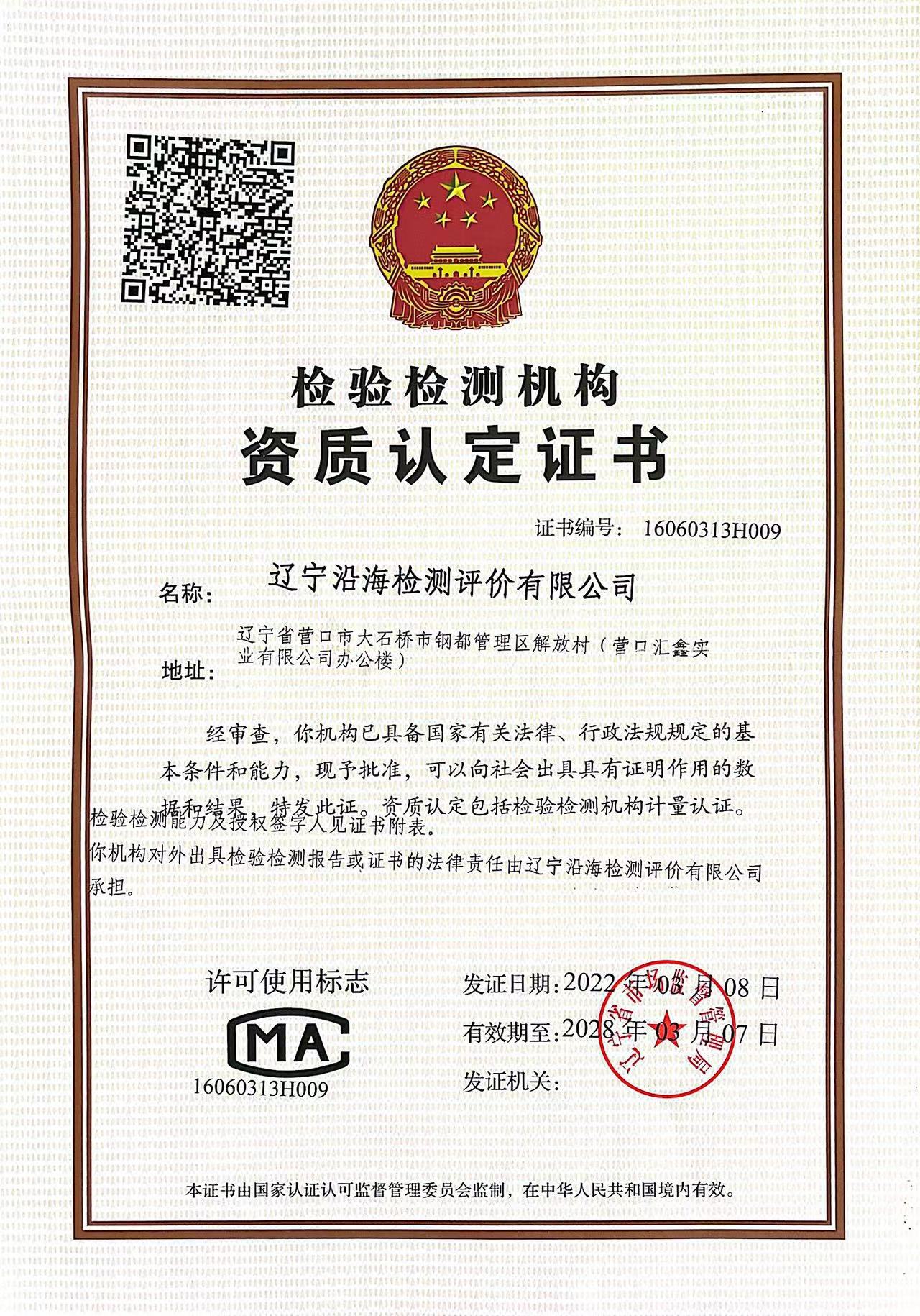 遼寧沿海檢測評(píng)價(jià)有限公司是通過國家資質(zhì)認(rèn)定的檢驗(yàn)檢測機(jī)構(gòu),擁有20人的檢測團(tuán)隊(duì),其中多人具有數(shù)十年的從業(yè)經(jīng)驗(yàn),包括,中級(jí)工程師3人,助理工程師1人,專業(yè)的工作經(jīng)驗(yàn),嚴(yán)謹(jǐn)?shù)墓ぷ髯黠L(fēng),為客戶提供優(yōu)質(zhì)的服務(wù)。